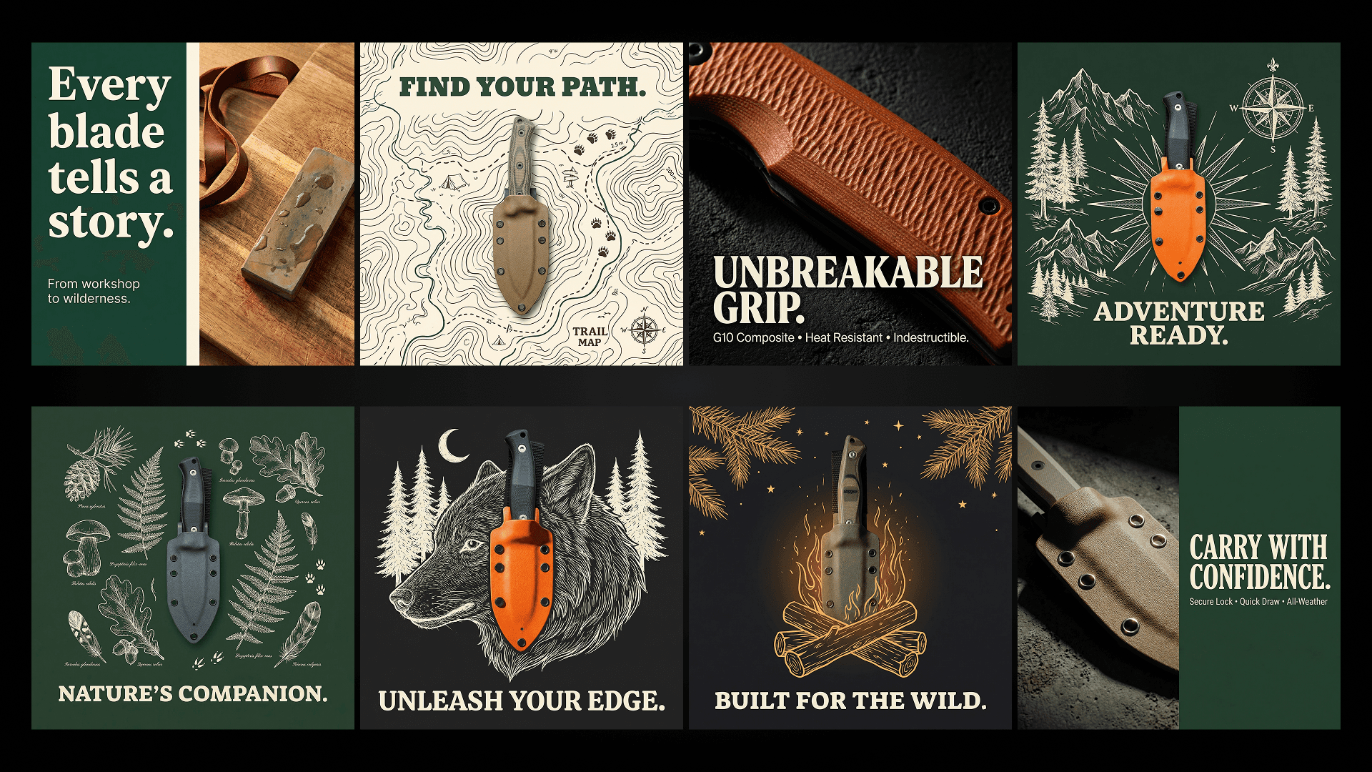 The site features an immersive "Our Story" section, a complete product catalog organized across outdoor, kitchen, pocket knives, sheaths, and accessories, and a design system built for scale. Alongside the website, we developed a full suite of social media assets, branded mockups, and campaign-ready ad creatives, giving Taz Knives a complete digital toolkit to grow beyond the market stall.