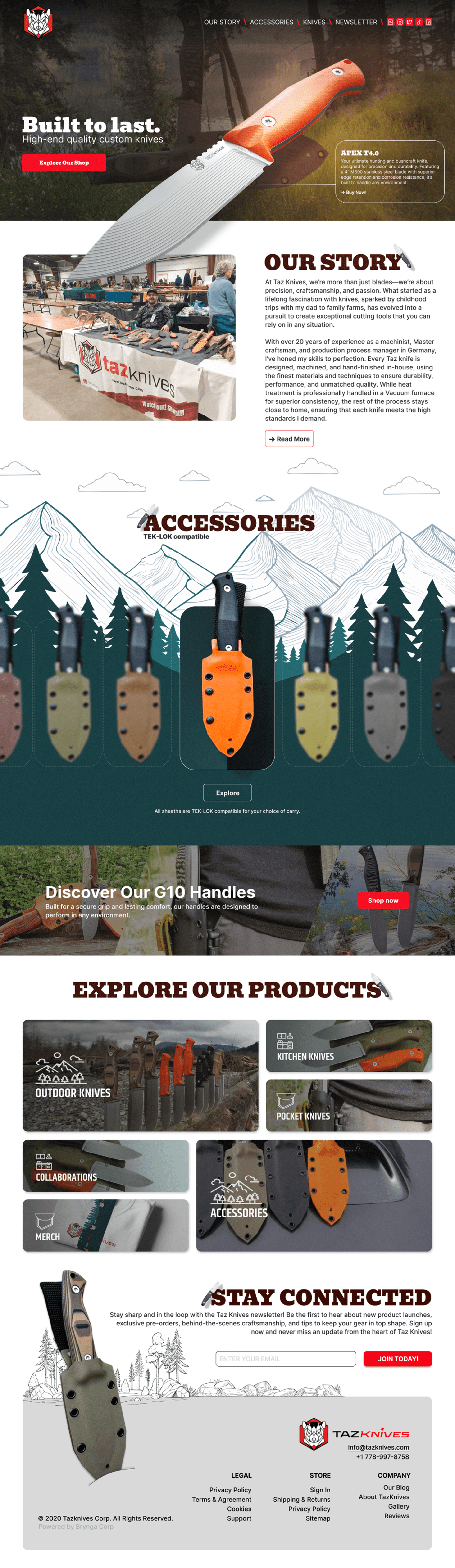 We designed a fully custom website that brings the Taz Knives brand to life, from a bold visual identity rooted in forest greens, burnt orange, and hand-drawn wilderness illustrations, to editorial-grade product photography that lets each blade speak for itself.
