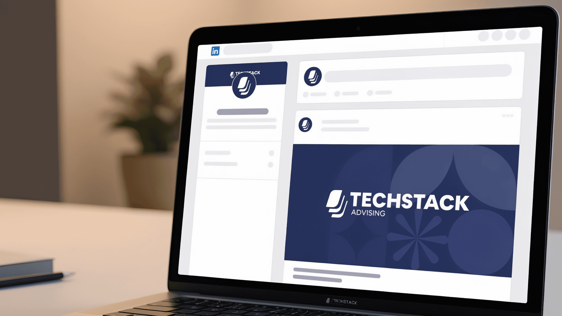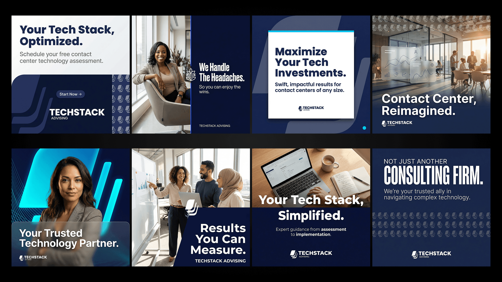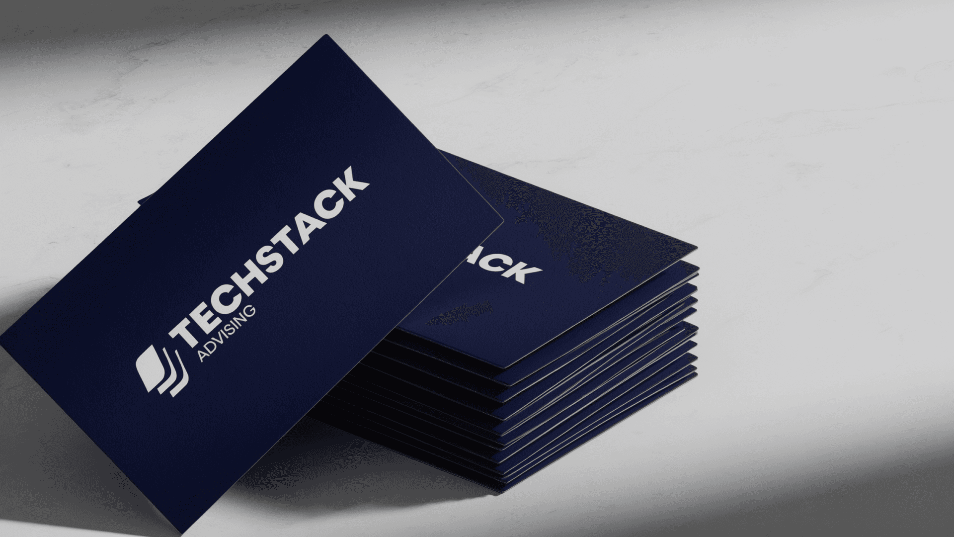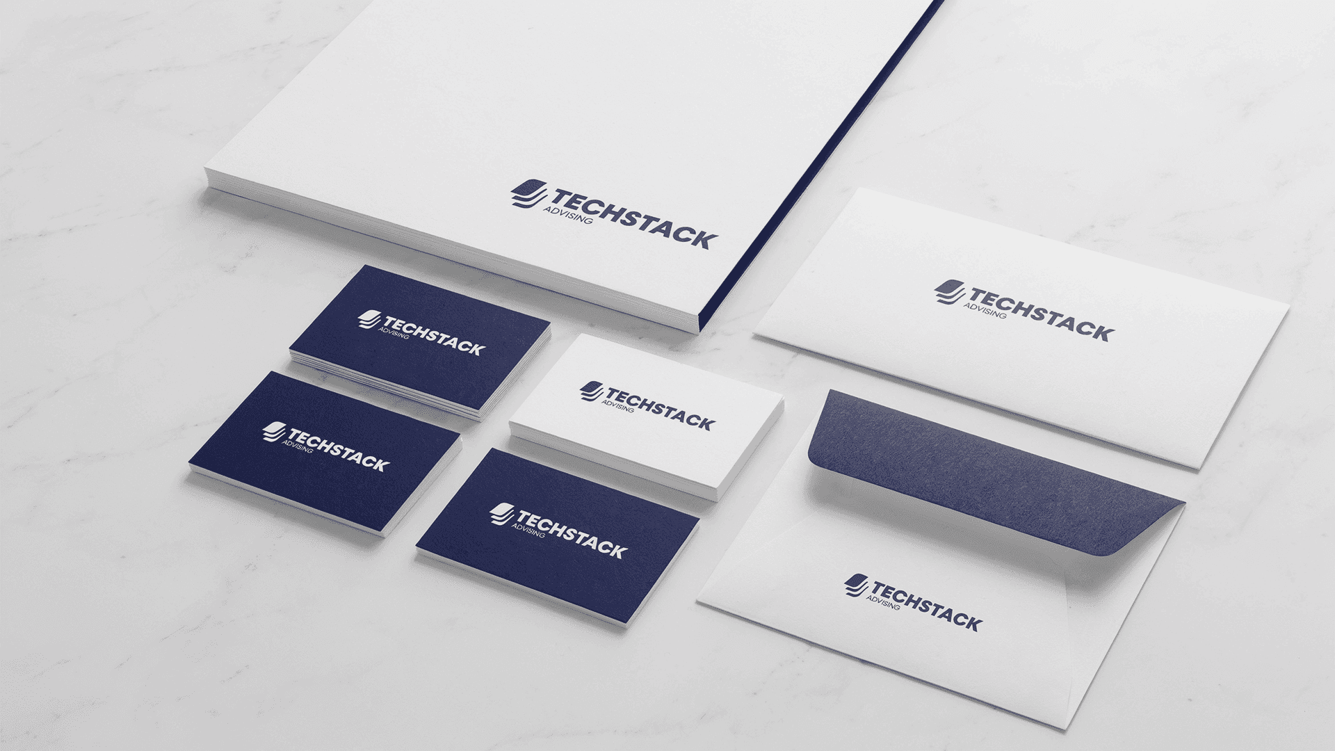 We built TechStack Advising a complete brand identity from the ground up, a bold navy and white visual system anchored by a custom “stacked layers” symbol that speaks directly to what they do.